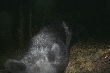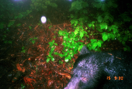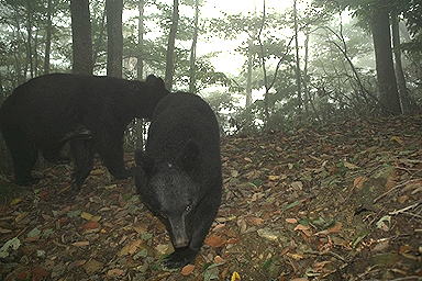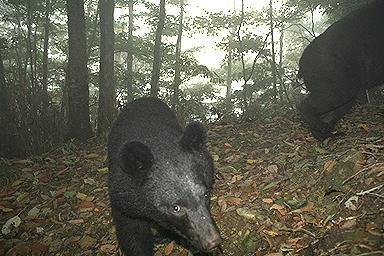 | 最高の連続写真! 2頭のクマが出現。関係は不明である。発光するセンサーカメラに興味を持ったのか,1頭が近づいてくる。その顛末は,写真が示す通りである。※©Yo Ogawa | |