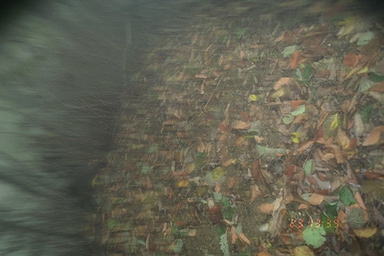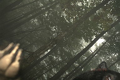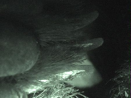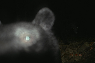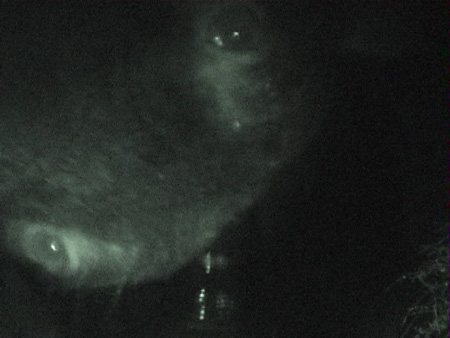 | 2000年撮影 クマ学術捕獲用トラップ脇にかけたデジタルビデオからのキャプチャー画像。 覗き込むクマの目! カメラに興味を持ったクマが,カメラの防水ハウジングと三脚を破壊していく・・・。 |