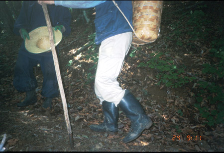 使い込まれて鈍く光る下草刈りの鎌の柄と,地下足袋に”はばき”の組み合わせがプロフェッショナルを感じさせます。腰の曲がり具合や,よく鍛えられた手の甲の感じから,ご高齢の方と思われます。