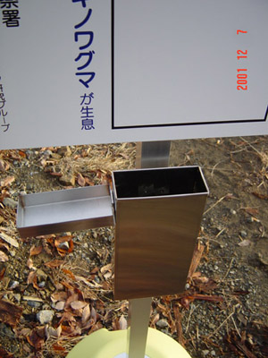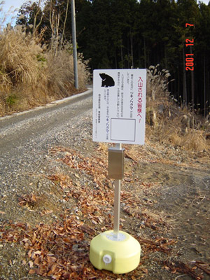 | 看板,支柱(ジョイントで分割式),台座などそれぞれのパーツは分解可能で,持ち運びが簡単にできるようになっています。材質にもアルミを多用して,軽量化に努めています。 | 看板の余白部には,クマの出没状況についてサインペンなどで書き込めるようになっていて,山の利用者へのより詳しい情報提供が可能です。看板は”風景”なるまで残地せず,クマの再出没がない場合は,2週間をめどに撤去します。 |