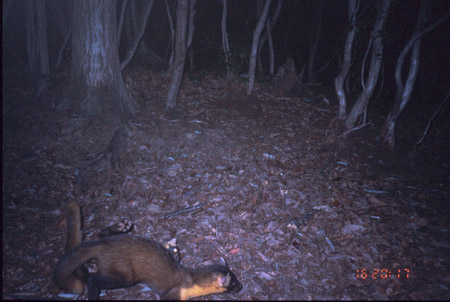 よく見ると1頭ではなくて,もう1頭が腹這いになっている。テンの交尾期は7〜8月とされているので,ペアなのかも知れなかった。