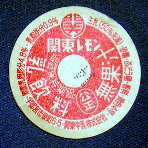ビンには青いシルク印刷で「関東 KANTO」、キャップは赤、上掛けビニールはピンク、
