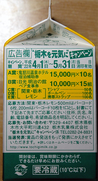 製造元:栃木乳業 いつの間にか着色料が黄色4号から、天然色素の紅麹と紅花黄に変わってました。(Wikipedia見てて気がつきました) ラインナップは引き続き、200mlと500mlの紙パック