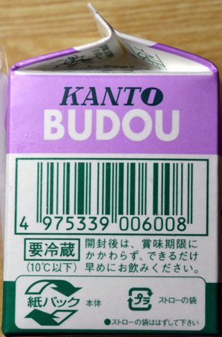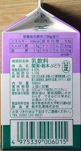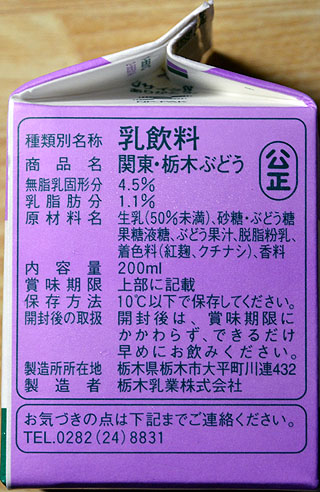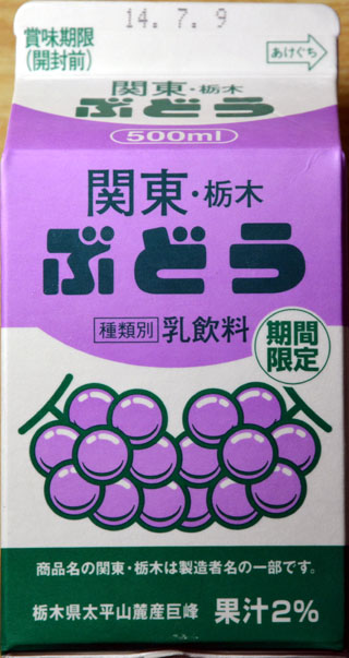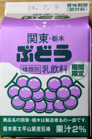 製造元:栃木乳業 200mlと500mlの紙パックがある 2013年7月発売、2014年にも再度発売 レモン牛乳姉妹品シリーズ第3弾として。夏秋限定のぶどう味が登場。 ぶどう果汁は栃木県太平山麓産の"巨峰"2%使用とのことで、いちごに続き栃木産です。 味の方は酸味甘味とも控えめで、ファンタグレープあたりを想定していると「ぶどう?」て感じになる。 液色も非常に地味。あずきバーみたいな色をしています。