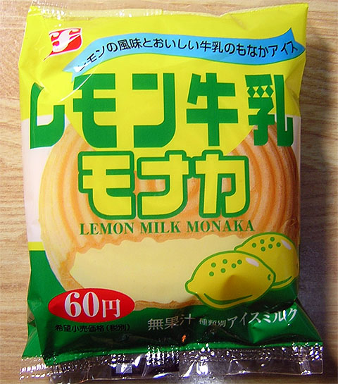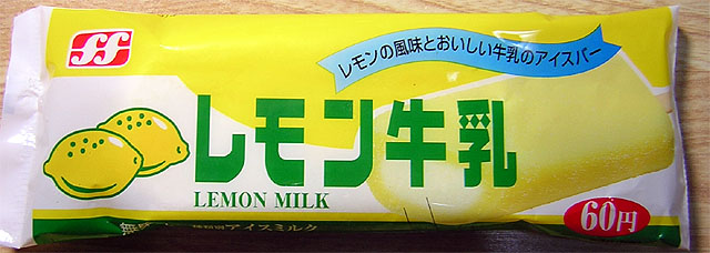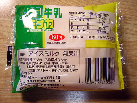製造元:フタバ食品 棒アイスとモナカの2種類。 関東レモンを意識したと思われるパッケージには、本家が名乗れない「牛乳」の文字が・・・ カップアイス発売に伴い、生産終了。
