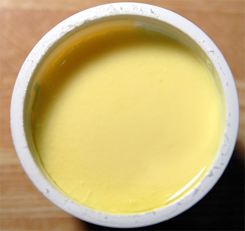 中身はやっぱり黄色い。現物は写真より鮮やかな黄色に見える 香料もやっぱり微妙。