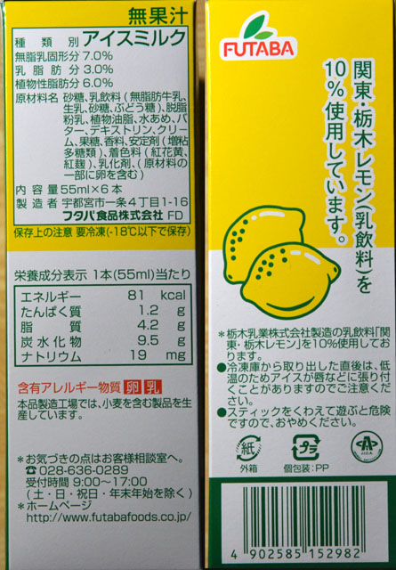 製造元:フタバ食品 レモン牛乳アイスのバータイプマルチ版。 かつて売られていたレモン牛乳アイスバーとは違い、カップアイスの中身を棒アイスにしたもの
