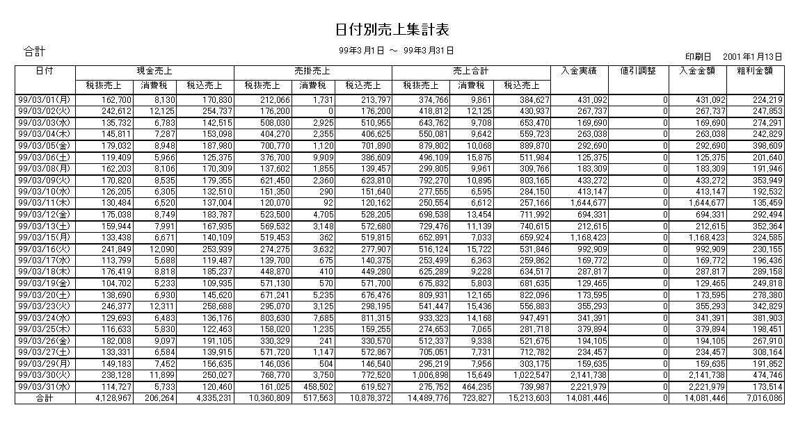 備考: 指定された期間の売上を日付ごとと印刷した後、合計を印刷する。