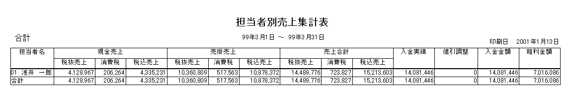 売上担当者別の場合、以下のように担当者別に日付ごとの売上実績を印刷し、