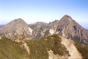 | 1. 三ツ頭直下の登山道より赤岳 | 2. 同じく権現岳の一部と赤岳 |