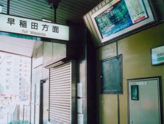 早稲田方面ホームの南口側です。 外のビルの様子もなんとなく似た雰囲気になっています。 ここの踏切は警報機も遮断機もないのですが、ケータイを見ながら電車の直前に突っ込む人が多く、傍から見てちょっとハラハラします。 |