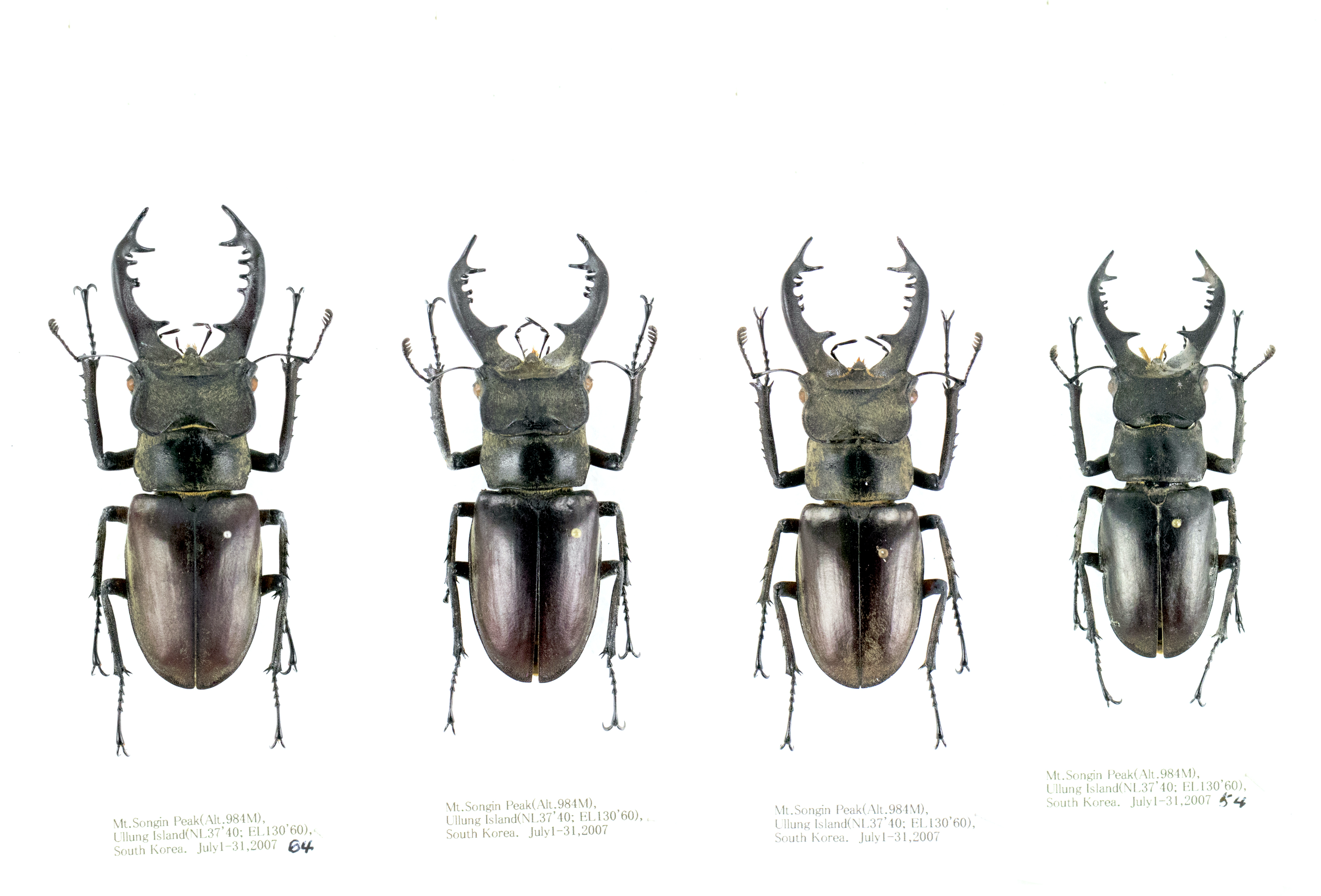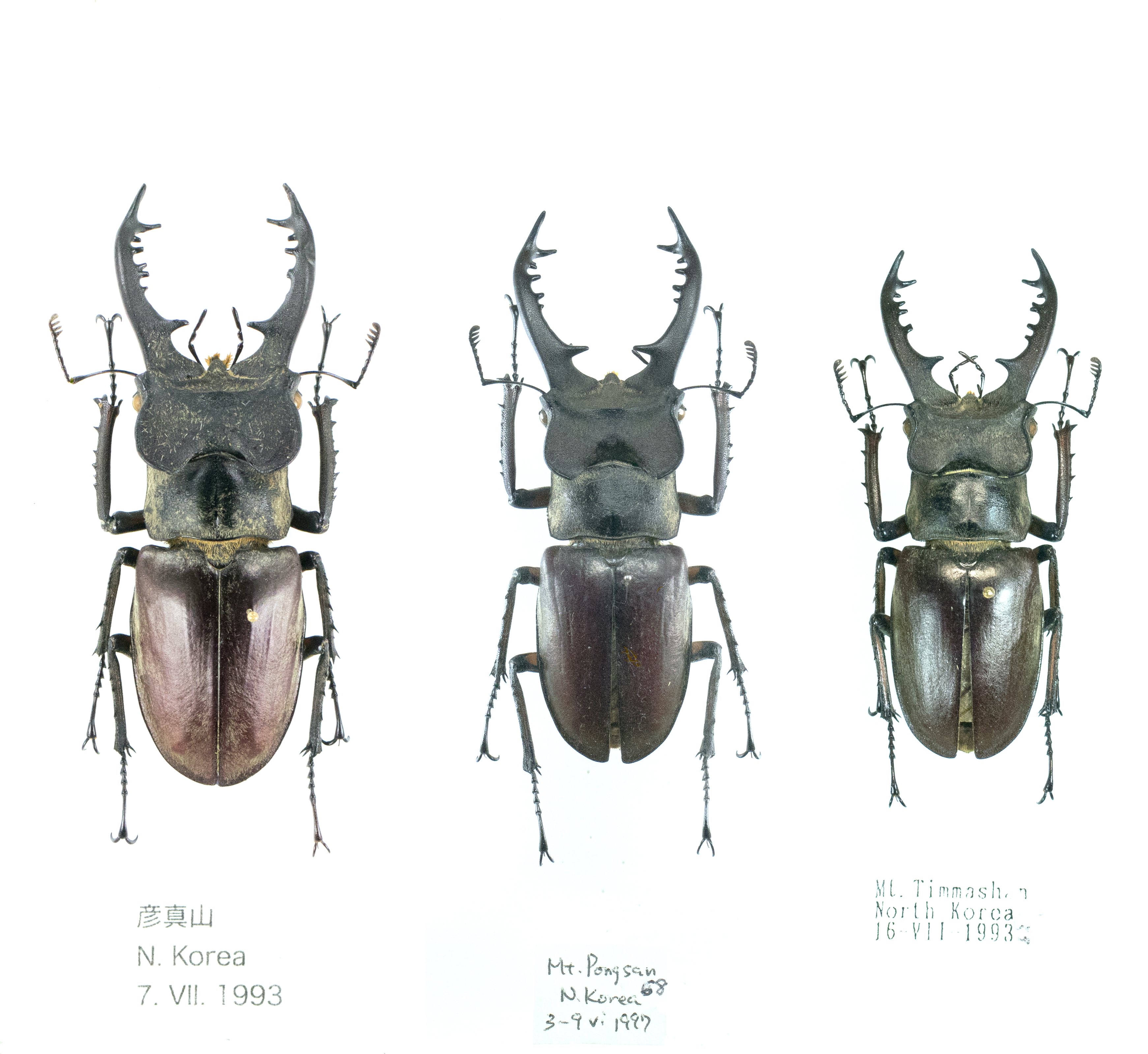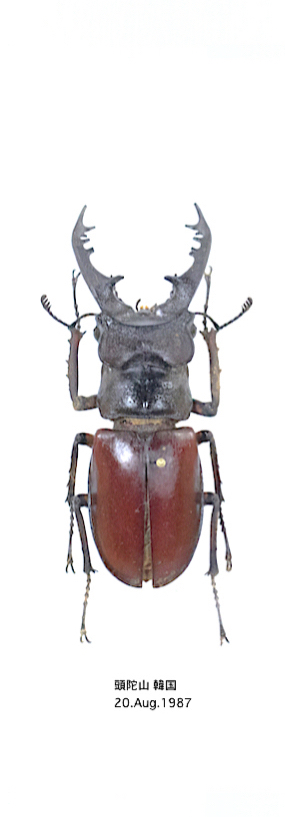 Lucanus dybowski dybowski Parry, 1873ユーラシア大陸及び台湾産ミヤマクワガタの近縁な種と亜種ユーラシア大陸の西側に広く分布する ヨーロッパミヤマクワガタ Lucanus cervus の仲間に対し日本産ミヤマクワガタ Lucanus maculifemoratus の近縁種は大陸の東側に広く分布しており、かっこよく言えば東西で双璧をなしている両グループでクワガタの中でもこのミヤマクワガタを耽溺(たんでき)し夜な夜な酒を飲みながら眺め、寝床に入り目をつぶるとミヤマの姿が現れると言う 危ない面々も少なからずおられると思う。 そんな妄想が頭の中を巡る中、奴隷的労働から解放され少し時間もできた。という事で暇に任せて久々にクワガタ話題、ユーラシア大陸東側のミヤマを少しだけ。 世界で初めて世界のクワガタを載せた 水沼,永井(1994) 世界のクワガタムシ大図鑑では大陸や台湾などに産する ミヤマクワガタ Lucanus dybowski など幾つかの種と日本産ミヤマクワガタを比べて外見上の違いは少なく更に小型個体では区別が難しくこれらを日本産の亜種 として扱った。藤田 (2010) 世界のクワガタムシ大図鑑はこれをほぼ踏襲している。 Huang & Chen (2010) Stag Beetles of China I は台湾、ユーラシア大陸東部、東南アジアなどのミヤマクワガタを詳細に比較しゲニタリアの写真なども載せた解説図鑑で 古い文献にあるミヤマクワガタの記載図なども載っている。この解説図鑑では日本の Lucanus maculifemoratus と大陸の Lucanus dybowski を別種として扱い大陸と台湾に分布する近縁種の幾つかは Lucanus dybowski の亜種としている。 ここでは幾つか近縁種の写真を載せてみた。 ![]() ![]() Lucanus dybowski dybowski Parry, 1873アムール川流域(Dauria *)で採集された個体により1873年に著名な昆虫学者 Parry, Frederick John Sidney 氏によって記載され 採集者ポーランド系フランス人Jean Thadée Emmanuel Dybowski 氏に献名された。文献によっては dybowskyi とか dybowskii と綴られているが記載文では dybowski となっている。 採集されたダウリア地方 (州) をGoogleマップで捜すとアムール川源流、モンゴル、中国、とロシアの国境地域で ( ザバイカルと沿アムール西部の17世紀以前のダウール族支配下の地 ) かなり内陸である。 手元にある標本は全て極東ロシアの日本海に面した沿岸地域で得られたものでナホトカあたりから N.Koria 国境近くまでのラベルが付いている。写真上段一番左は71mm。ロシア内の生息地域に関して、 RED BOOk OF THE AMUR REGION (2019 Russia) で調査されておりアムール地域が北限でハバロフスク地方南部、ユダヤ自治州で記録されているが稀で、沿岸地域ではシホテ-アリニ (Сихотэ-Алиня) の 西から良く見られると書かれロシア沿岸地域あたりから N.Koria 国境まで広く分布しているようだ。 最近の記録ではLamellicorn Beetles (Coleoptera, Scarabaeoidea) of the Islands of the Peter the Great Gulf, Sea of Japan (Primorsky Krai of Russia) by Vitaly G. Bezborodov (2023) にロシア沿岸地域に隣接する島々 Putyatin Island. や PoPov Island. でも7月中頃から8月にかけて少数採集されているとの記述がある。 また、ミヤマクワガタを研究し多くの素晴らしい図と文献を残している Louis PLANET 氏は ESSAI MONOGRAPHIQUE PSEUDOLUCANE II 1901-1902 の中にウラジオストクから近い小さい離島アスコルド島 (Аскольд) から得られた♀の図を載せている。 ロシアは広大な面積を持ち西方にはヨーロッパミヤマ Lucanus cervus が分布し更に樺太南部 (サハリン) には日本産と同じミヤマクワガタ Lucanus maculifemoratus も分布 (林長閑 1987) する。 ![]() Lucanus dybowski dybowski Parry, 1873朝鮮半島からのもので左側の3頭が N.Korea から一番右が S.Korea産。N.Koreaの 虫 (標本です) は1990年代頃に比較的よく日本に入って来ていたが現在どうなのかは知らない。一番左のものはサイズが71.5mm, ![]() Lucanus dybowski dybowski Parry, 1873S.Korea の鬱陵島(ウルルン島)採集のラベルが付く、だが採集者は不明で来たものに残念ながら完品は無かった。数頭の標本をジーッと眺めた結果、大腮が S.Korea 本土のものと比べて若干湾曲が強く下側に 向かっても湾曲が少し強い。日本産ミヤマクワガタ Lucanus maculifemoratus は多くの離島に生息するが伊豆諸島のものは亜種とされている。離島と言えばクワガタ好きなら 皆んな大好き対馬だが、甲虫研究の大御所 林長閑氏は文一総合出版 日本の昆虫⑧ ミヤマクワガタ (1987)の中でミヤマクワガタ基本型の分布地の一つとして 対馬をあげている。この本が発行されてからずいぶん経つがミヤマクワガタに関して多くの知識を得られる必見の書である。 ![]() Lucanus dybowski dybowski Parry, 1873中国産でサイズは全て65mm前後、一番右のものは Lucanus jilinensis として記載者から送られてきた標本だがパラタイプではない。李景科 (1992) THE COLEOPTERA FAUNA OF NORTHEAST CHINA P-68 にある記載文に図は無くホロタイプは遼寧省銭山産との記述。Krajik(2001) LUCANIDAE of THE WORLD では亜種 Lucanus maculifemoratus jilinesis Li 1992 とされている。水沼,永井(1994) 世界のクワガタムシ大図鑑では Lucanus dybowski と同じものと思われると 書かれ、後に発行